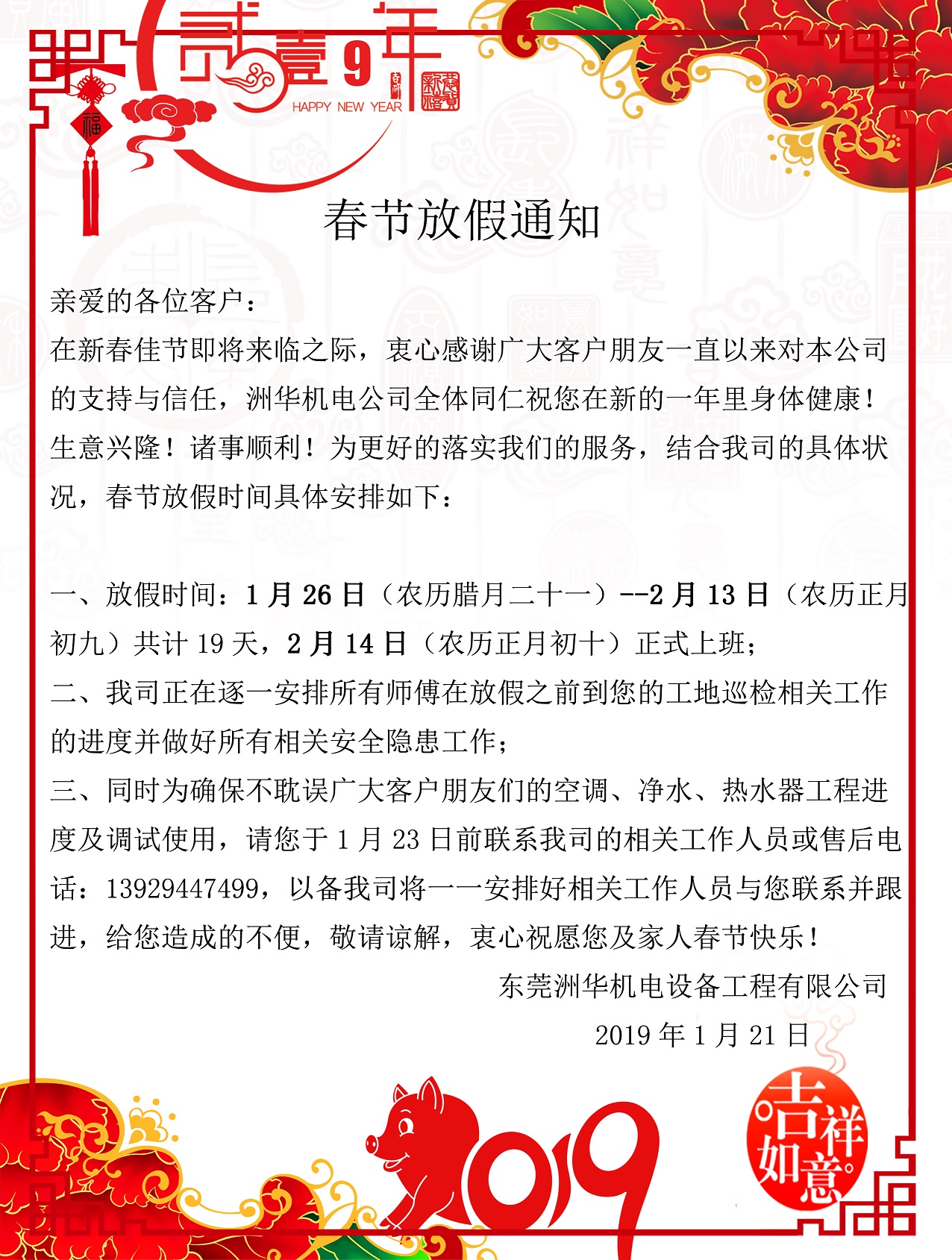 2019-01-232019洲華機電春節放假通知:在新春佳節即將來臨之際,衷心感謝廣大客戶朋友一直以來對本公司的支持與信任,洲華機電公司全體同仁祝您在新的一年里身體健康!生意興!諸事順利!